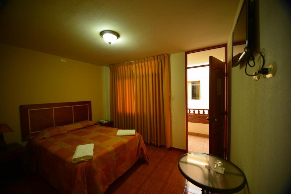This room features a private bathroom with shower, cable TV, closet, nightstand, and Andean paintings on the walls.